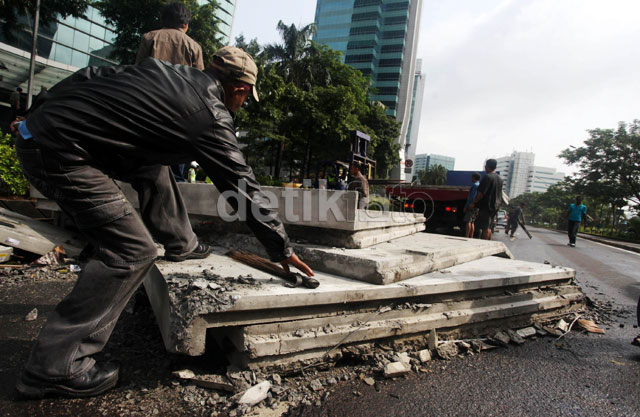 Jakarta - Sebuah truk bermuatan beton terguling di depan gedung Menara Karya di Jalan Rasuna Said, Kuningan, Jakarta Selatan, Jumat (21/2/2014) dini hari tadi. Akibatnya, muatan tersebut tumpah ke jalan dan menyebabkan kemacetan arus lalu lintas pagi ini.