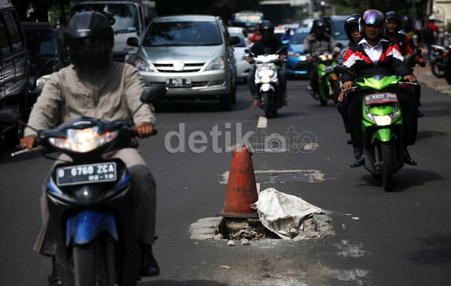 - Sebuah gorong-gorong menganga di tengah jalan di kawasan Jalan Sudirman, Jakarta, Selasa (25/02/2014). Gorong-gorong sedalam 2 meter ini pun mengancam keselamatan pengendara.