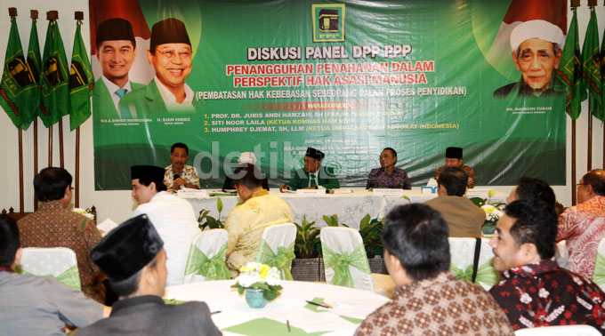 PPP Gelar Diskusi Penangguhan Penahanan dalam Perspektif HAM BAGIKAN URL telah disalin Diskusi "Penangguhan Penahanan dalam Perspektif Hak Asasi Manusia" digelar di Kantor DPP PPP, Jakarta Pusat, Jumat (19/6/2015). Koordinator Desk Kebebasan Beragama dan Berkeyakinan Komnas HAM Jayadi Damanik memberikan pemaparan. Ketum PPP Djan Faridz (tengah) mendengarkan pemaparan dari nara sumber diskusi "Penangguhan Penahanan dalam Perspektif Hak Asasi Manusia". Ketum PPP Djan Faridz memberikan plakat kepada nara sumber usai diskusi panel DPP PPP.