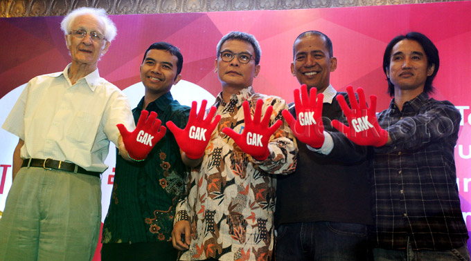 (Kiri ke kanan) Rohaniawan Romo Magnis Suseno, Koordinator ICW Adnan Topan Husodo, Plt Pimpinan KPK Johan Budi, pakar hukum tata negara Saldi Isra, dan musisi Berkah Gumulya menunjukkan sarung tangan bertuliskan GAK (Gerakan Anti Korupsi).