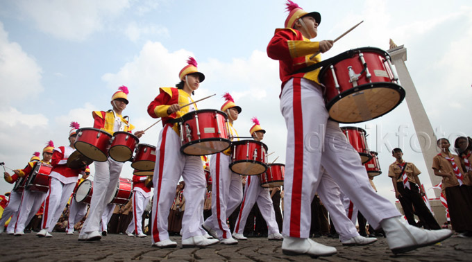Beragam Atraksi Ramaikan Hari Pramuka BAGIKAN URL telah disalin Atraksi marching band. Devile sekolah. Ada juga pertunjukan reog Ponorogo. Ondel-ondel. Aksi ini disaksikan ribuan anggota pramuka. Aksi ini dalam rangka menyemarakan acara puncak hari jadi Pramuka yang juga bertepatan HUT RI ke-70 tahun. Beragam atraksi dipertontonkan oleh anggota pramuka.