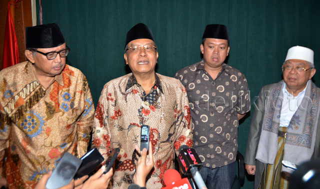 Ketua Umum PBNU, Said Aqil Siradj, (kedua kiri), Rais Aam Ma'ruf Amin (kanan), Wakil Ketua Umum, Slamet Efendi Yusuf (kiri) dan Wakil Ketua, Nusron Wahid yang merupakan susunan pengurus PBNUJ 2015-2020. Pool/Lamhot Aritonang/detikFoto.