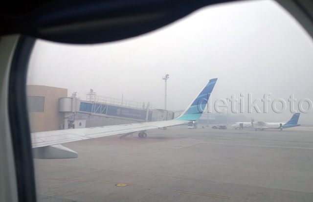 - Kabut asap menutupi Bandar Udara Internasional Sultan Mahmud Badaruddin II, Palembang, Sumatera Selatan, Senin (26/10/2015). Meski demikian operasional bandara tetap berjalan normal.
