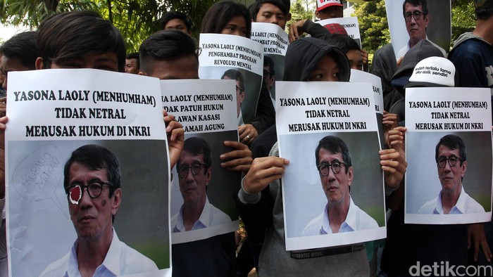 Jakarta - Gerakan Pemuda Mahasiswa Islam (GPMI) berdemo di Kementerian Hukum dan HAM. Mereka mendesak Menkum HAM Yasonna Laoly mengesahkan kepengurusan PPP Djan Faridz.