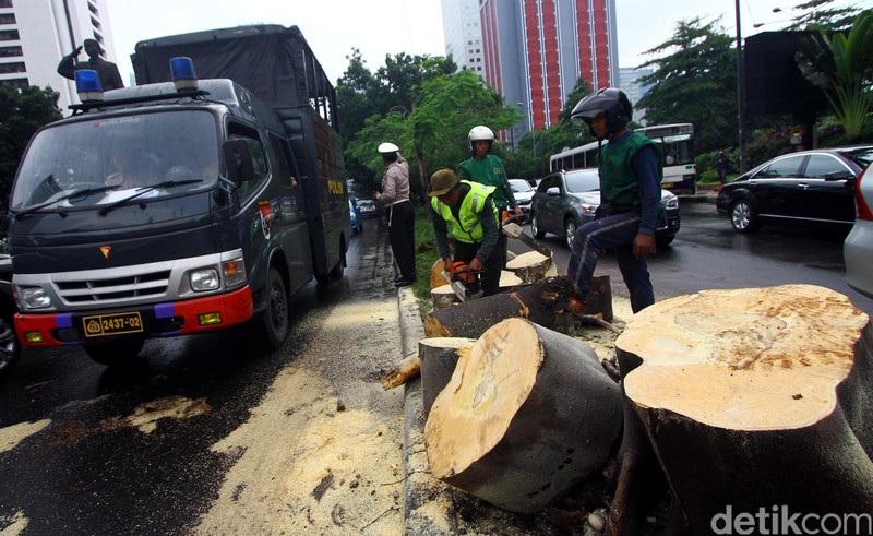 Pohon tumbang tersebut segera dibersihkan oleh petugas Dinas pertamanan DKI Jakarta.