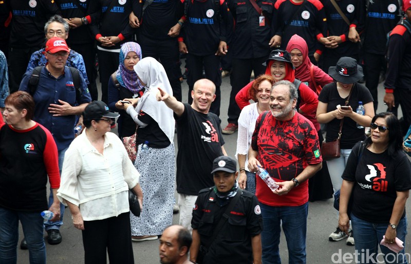 Beberapa WNA perwakilan organisasi buruh internasional ikut aksi demo memperingati HUT ke-17 Federasi Serikat Pekerja Metal Indonesia (FSPMI), Sabtu (6/2/2016).