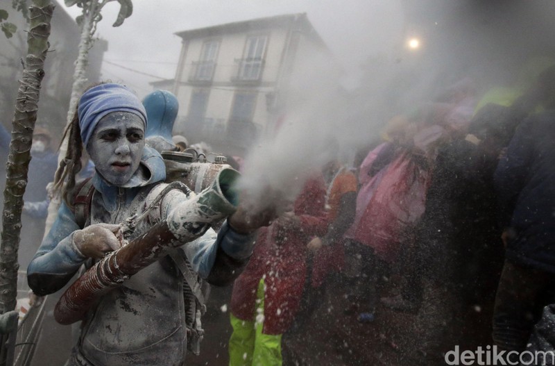 Seorang perserta menembakan tepungnya ke udara saat berpartisipasi dalam pertarungan tepung dalam festival "O Entroido" di desa Laza, Spanyol 8 Februari 2016. REUTERS/Miguel Vidal.
