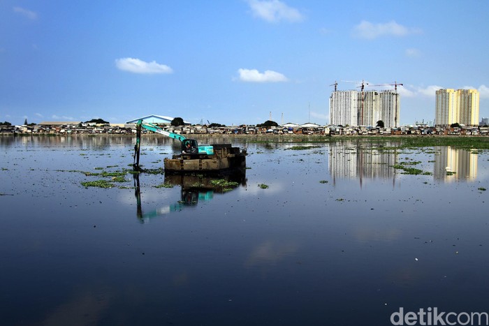 Jakarta - Petugas membersihkan eceng gondok yang menumpuk di Waduk Pluit, Jakarta Utara, Rabu (16/3). Hal ini untuk mencegah pendangkalan waduk.