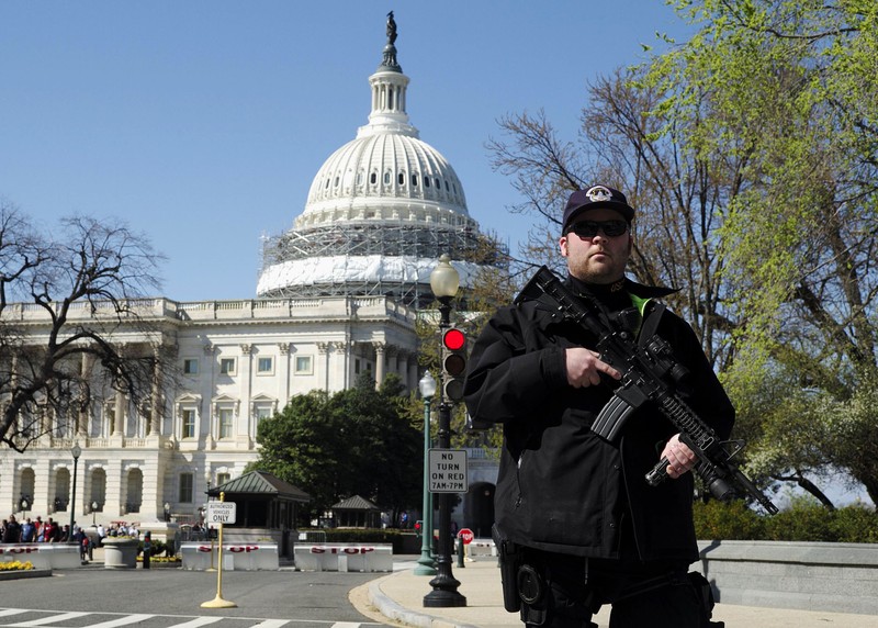 Polisi bersenjata api laras panjang berpatroli di sekitar Gedung Capitol. Mike Theiler/Reuters.