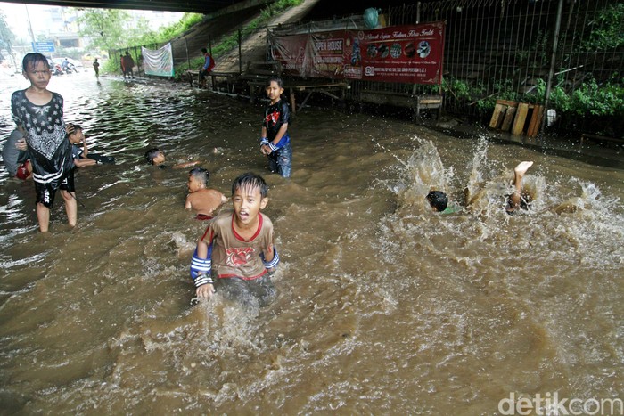 Jakarta - Banjir di Jalan KH Noor Alie, Kalimalang, Bekasi, dimanfaatkan anak-anak untuk bermain air. Begini keceriaan anak-anak bermain banjir.