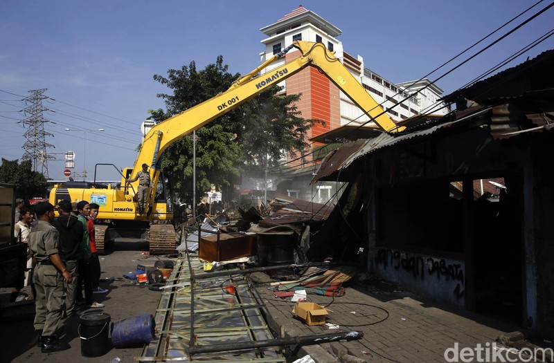 Penertiban Bangunan Liar di Jakarta Timur BAGIKAN URL telah disalin Petugas gabungan menertibkan 31 kios dan bangunan liar yang berdiri diatas saluran air dan taman di Jl Letjen Sutoyo Jakarta Timur, Rabu (25/5/2016). Sedikitnya sekitar 300 petugas gabungan berasal dari unsur personel kelurahan, kecamatan, Satpol PP, TNI/Polri diterjunkan. Pengerahan personel tersbut demi terciptanya keamanan dan kenyamana penertiban 31 bangunan liar tersebut. Satu unit alat berat jenis beckhoe dan 10 truk untuk membersihkan puing sisa-sisa penertiban. Pemilik 31 bangunan yang akan dibongkar sebelumnya telah diberikan surat peringatan (SP) 1 hingga 3. Bangunan dan Kios liar tersebut berdiri di atas jalur hijau. Sejumlah warga menyelamatkan barang barang mereka yang masih bisa diselamatkan.