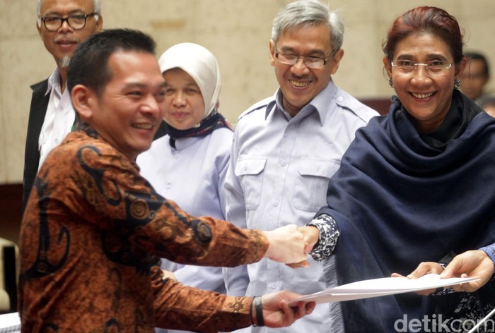 Jakarta - Menteri Kelautan dan Perikanan Susi Pudjiastuti dan Mentan Amran Sulaiman mengikuti rapat kerja dengan Komisi IV DPR di Kompleks Parlemen, Jakarta, Rabu (22/6).