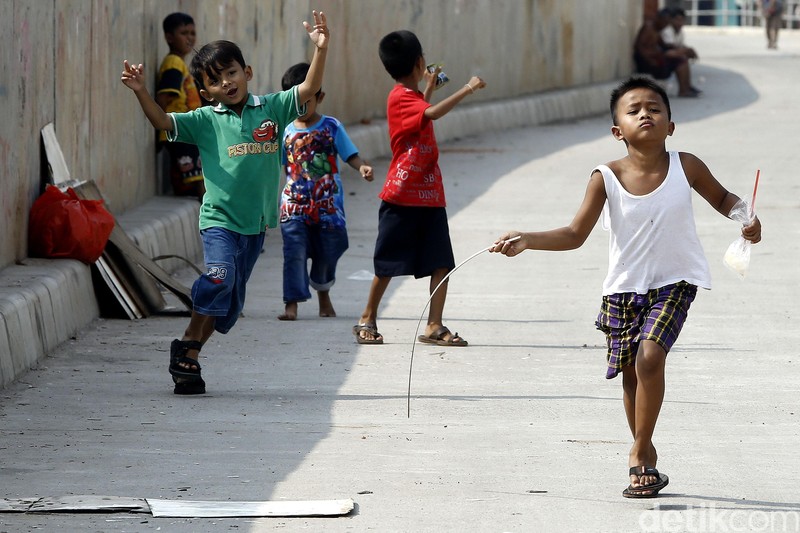 Minim Lahan, Anak-anak Bermain di Jalan dan Bantaran Sungai BAGIKAN URL telah disalin Sejumlah anak asyik bermain di jalan di kawasan Bukit Duri, Jakarta. Bantaran sungai juga dijadikan sebagai arena bermain. Dua orang anak yang bermain sepatu roda melintas di samping gerobak sampah. Meski hanya menggunakan peralatan bermain seadanya, anak-anak itu tetap ceria. Anak-anak memilih jalan dan bantaran sungai karena masih minimnya lahan bermain di kawasan Bukit Duri.