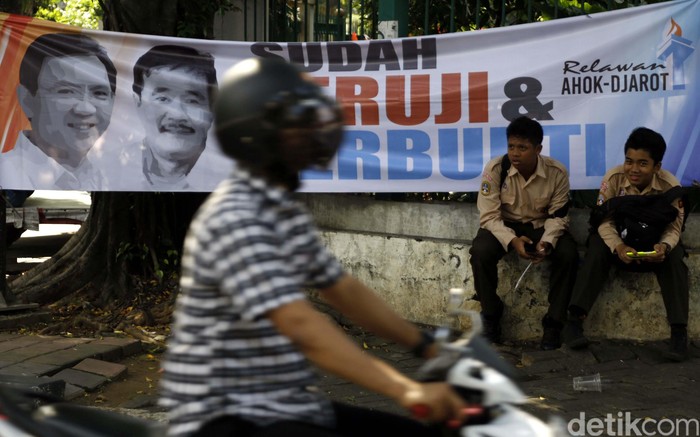 Jakarta - Spanduk dukungan Ahok-Djarot mulai bermunculan di sejumlah tempat. Salah satunya di Jalan Diponegoro, Menteng, Jakarta.