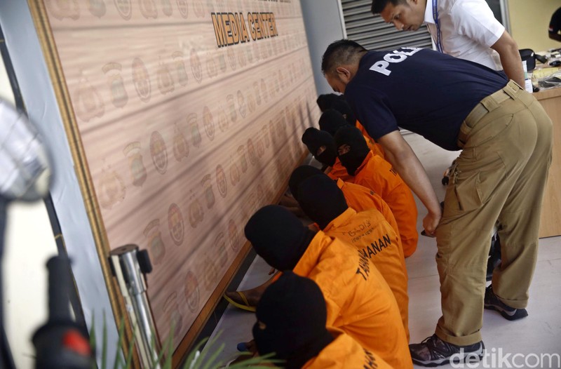 Para pelaku kejahatan dihadirkan dalam jumpa pers di Mapolda Metro Jaya, Senin (15/8/2016).