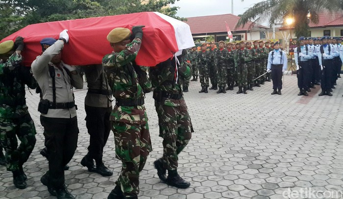 Jakarta - Jenazah Pratu Wahyudi yang gugur dalam pemadaman kebakaran lahan diberangkatkan menuju kampung halamannya di Magetan, Jateng.