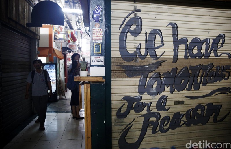 Seorang pengunjung melintas di depan kios yang telah tutup.