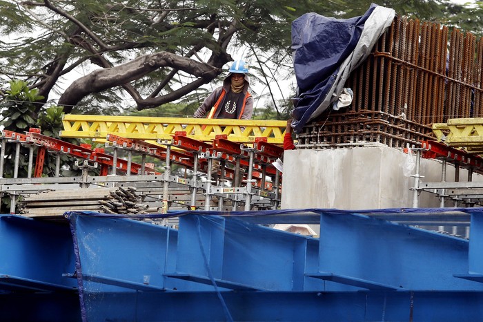 Pekerja menyelesaikan pembangunan simpang susun Semanggi.