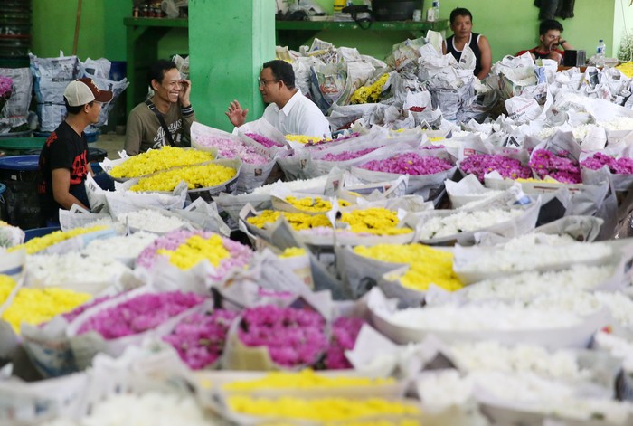 Jakarta - Calon Gubernur DKI Jakarta nomor urut 3, Anies Baswedan menyapa pedagang bunga Rawa Belong. Ia mendengar aspirasi pedagang dan sempat membeli mawar merah.