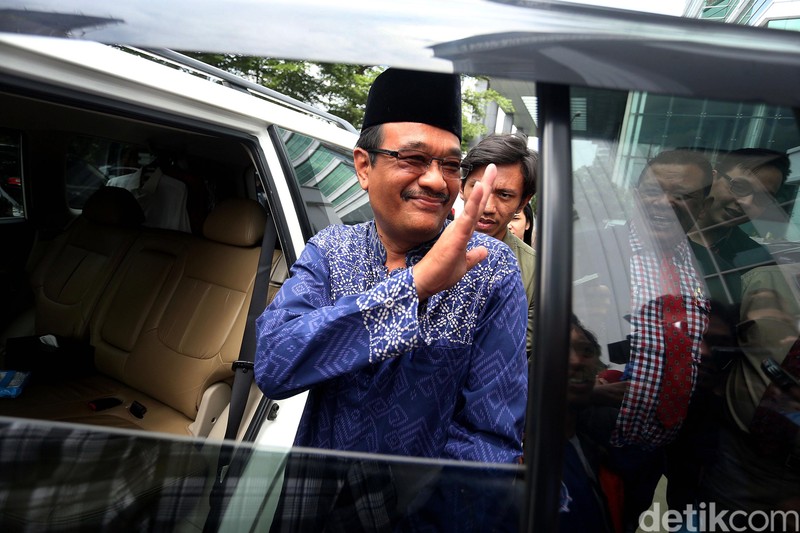 Ia mengenakan peci hitam dan mengenakan baju batik biru dipadu celana jeans dengan warna sepadan.