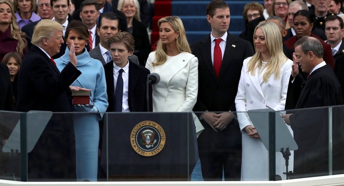 Donald Trump disumpah untuk menjadi Presiden Amerika Serikat dengan disaksikan istri dan anaknya. Kevin Lamarque/Reuters/detikFoto.