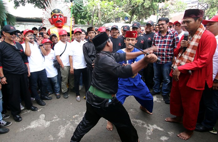 Foto Cawagub Djarot Pantau Apel Siaga Relawan Kerja Pool - detikNews Minggu, 05 Feb 2017 16:47 WIB Jakarta - Calon Wakil Gubernur DKI Jakarta Djarot Saiful Hidayat menghadiri acara Apel Siaga Relawan Kerja di GOR Kebon Jeruk, Jakarta Barat. Acara Apel Siaga Relawan Kerja yang digelar di GOR Kebon Jeruk, Jakarta Barat, Minggu (5/2/2017) dibuka dengan palang pintu.Β Cawagub Djarot Saiful Hidayat bersama anggota DPR RI Komisi I menyaksikan atraksi palang pintu. Ratusan relawan menghadiri Apel Siaga relawan Kerja untuk pemenangan Basuki-Djarot jelang pelaksanaan Pilkada 15 Februari mendatang. Tak ada jarak, Djarot pun ikut bermain musik bersama dalam pantauan Apel Siaga Relawan Kerja tersebut. djarot saiful hidayat