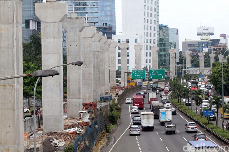 Sejumlah kendaraan melaju di dekat lokasi proyek konstruksi stasiun Mass Rapid Transit (MRT) di Cilandak, Jakarta, Jumat (17/2/2017).