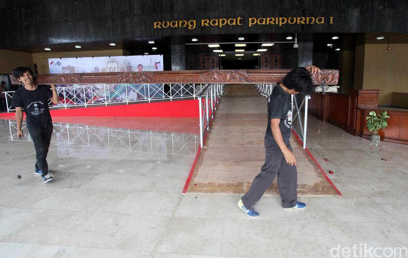 Dekorasi Penyambutan Raja Salman di DPR Dibongkar BAGIKAN URL telah disalin Sejumlah pekerja membongkar dekorasi di Ruang Rapat Paripurna I. Bunga-bunga yang menghiasi ruang rapat pun dibongkar. Karpet merah digulung. Sebelumnya karpet merah tersebut menjadi jalur Raja Salman untuk memasuki gedung DPR. Kain-kain yang sebelumnya dipasang untuk menghiasi jalur Raja Salman menuju ruang rapat Paripurna mulai dilepas. Dua orang pekerja membongkar bunga-bunga di depan podium DPR. Sejumlah pekerja membongkar dekorasi penyambutan Raja Salman. Pekerja juga membersihkan ruang pertemuan Raja Salman dengan pimpinan dan anggota DPR.