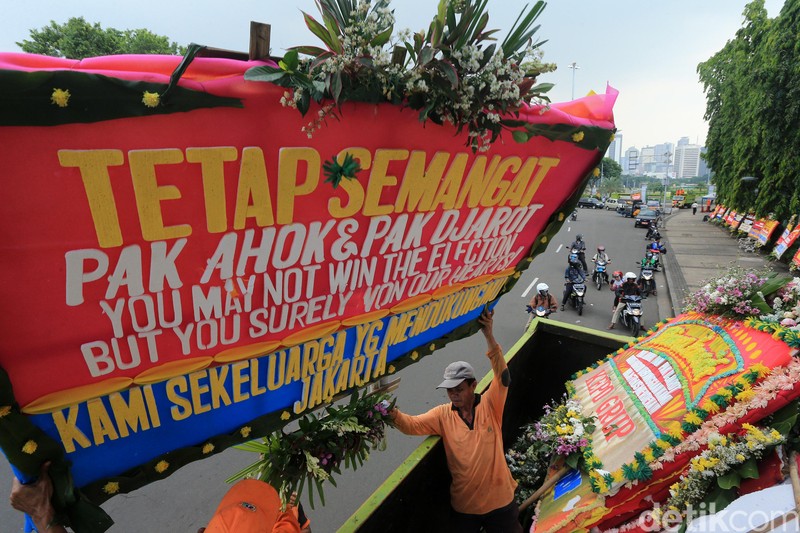 Karangan Bunga untuk Ahok Kelilingi Monas BAGIKAN URL telah disalin Petugas Dinas Kebersihan DKI memindahkan karangan bunga untuk Ahok-Djarot ke pagar Monas, Kamis (27/4/2017). Beberapa petugas menurunkan karangan bunga dari atas truk untuk diletakkan di depan pagar Monas. Karangan bunga itu diletakkan di luar pagar yang menghadap ke jalan bukan di dalam area Monas. Pemprov DKI mengklaim sudah ada 2.700 karangan bunga yang diterima di Balai Kota. Petugas Dinas Kebersihan DKI memindahkan karangan bunga ke pagar Monas. Tak sedikit dari warga yang berfoto-foto di depan karangan bunga untuk Ahok-Djarot.