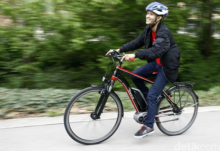 Jakarta - Peneliti muda Bosch Indonesia Raafi Jaya Sutrisna dan Suptihatin mencoba mengendarai sepeda elektronik (e-bike) produk Bosch di Taman Stuttgart, Jerman.
