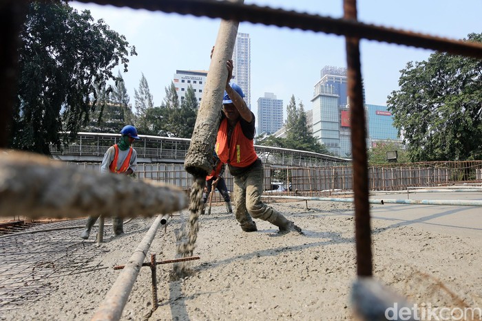 Jakarta - Para pekerja mengecor badan jalan di proyek simpang susun jembatan Semanggi, Jakarta, Jumat (19/5). Proyek ini ditargetkan bisa dipergunakan Agustus mendatang.