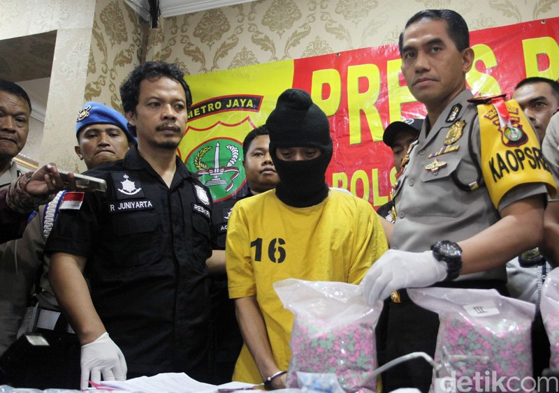 Kapolres Jakarta Utara Kombes Pol Dwiyono menunjukkan tersangka dan barang bukti ekstasi, Senin (29/5/2017).