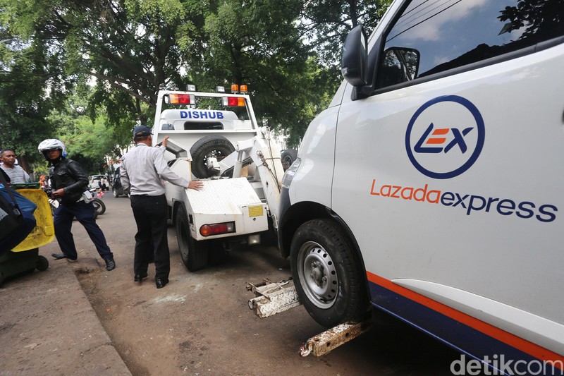 Sebuah mobil angkutan barang milik perusahaan jasa belanja online di derek petugas karena parkir sembarangan di pinggir jalan.