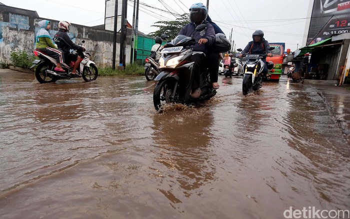 Jakarta - Jalan Parpostel Raya, Kabupaten Bogor, rusak parah. Meski tidak turun hujan, jalan ini tetap tergenang bak sungai.