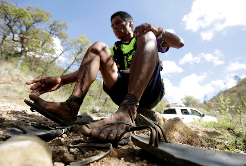 Dalam lomba marathon tersebut, suksu Tarahumara tidak menggunakan sepatu melainkan hanya memakai sandal yang terbuat dari karet daur ulang. REUTERS/Jose Luis Gonzalez.