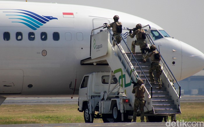 Jakarta - TNI AL menggelar simulasi penangananan teroris di Bandara Internasional Juanda Surabaya. Simulasi itu mulai dari pelumpuhan teroris di bandara hingga pesawat.