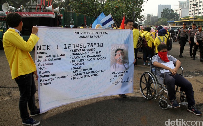 Demo, Mahasiswa Sindir Setya Novanto BAGIKAN URL telah disalin Massa membawa replika KTP raksasa dengan foto Setya Novanto yang tengah terbaring di rumah sakit. Mahasiswa mendesak agar Ketua DPR Setya Novanto ditangkap dalam dugaan kasus e-KTP. Aksi ini berjalan damai. Mereka juga meminta kasus korupsi e-KTP segera dituntaskan.