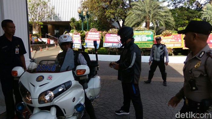 Anies tiba di Balai Kota hari ini pukul 07.47 WIB dengan membonceng motor patwal Dishub