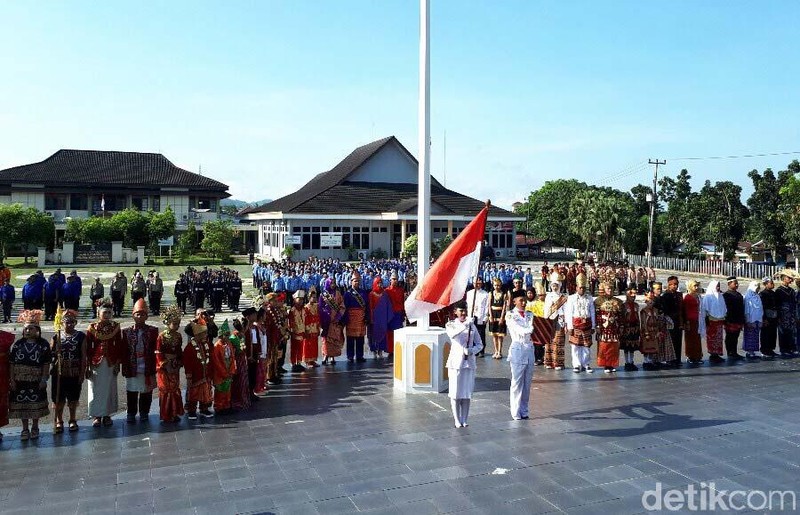 Wali Kota Pangkalpinang bersama murid-murid SD dan SMP setempat yang hadir mengenakan pakaian adat dari 34 provinsi di Indonesia.