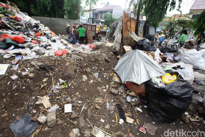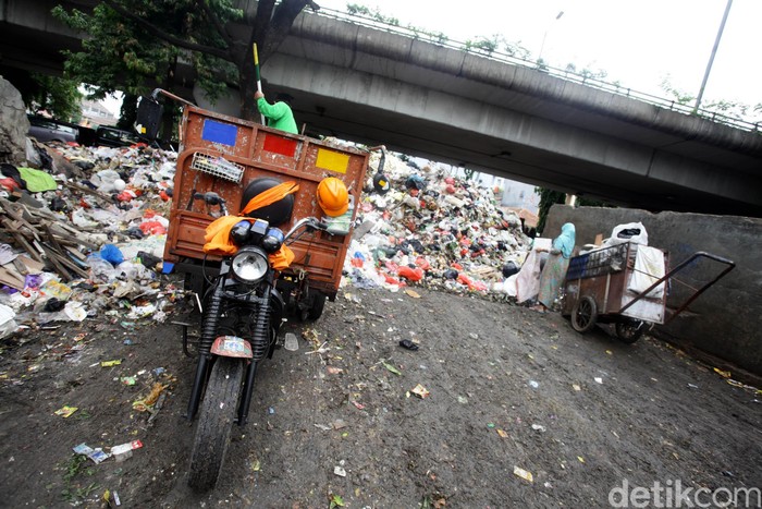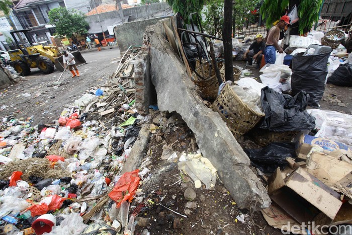 Jakarta - Tembok tempat sampah di bawah Flyover Kampung Melayu, Jakarta Timur, jebol. Sampah pun meluber dan bikin kotor ke ruang terbuka hijau.