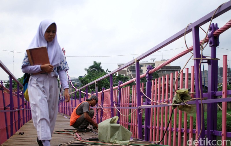 Jembatan yang berwarna seperti warna rumah berbie ini dipasang untuk memberikan keamanan bagi masyarakat yang melintas guna mempersingkat waktu tempuh.
