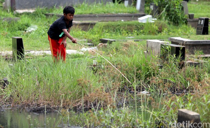 Jakarta - Area pemakaman di Tanah Kusir, Jakarta Selatan, selalu terendam air. Hal ini dimanfaatkan sejumlah anak untuk memancing di kawasan tersebut.