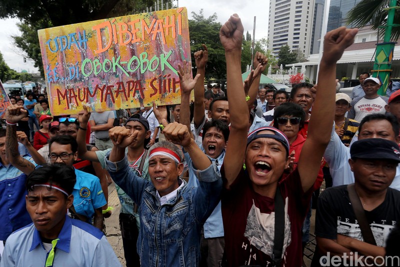 Begini penampakan ratusan sopir Mikrolet yang melakukan demonstrasi di depan Balai Kota DKI Jakarta, Senin (22/1/2018).