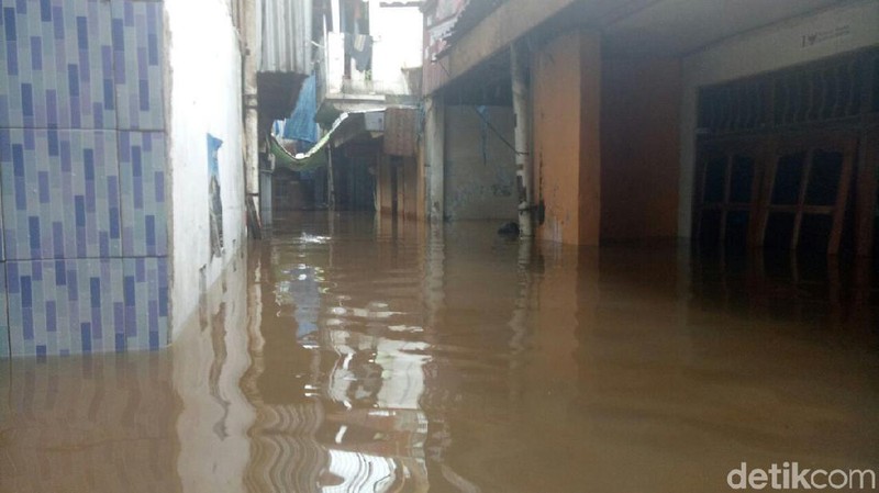 detikcom memantau banjir di wilayah RT 013 RW 004 Kampung Melayu, Jakarta Timur, Senin (5/2/2018) pukul 14.10 WIB.