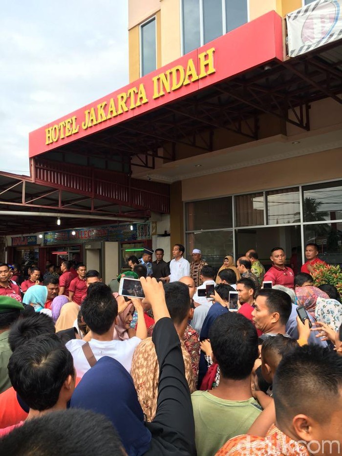 Begini situasi saat warga berfoto bareng Jokowi di depan hotel tersebut. Pihak protokoler Istana menyebut Jokowi tak komplain saat bermalam di hotel tersebut. βHotelnya adanya yang ini yang paling bersih. Tidak ada keluhan sama sekali dari Presiden,β ujar Deputi Bidang Protokol, Pers dan Media Sekretariat Presiden Bey Machmudin. (Foto: Ray Jordan/detikcom)