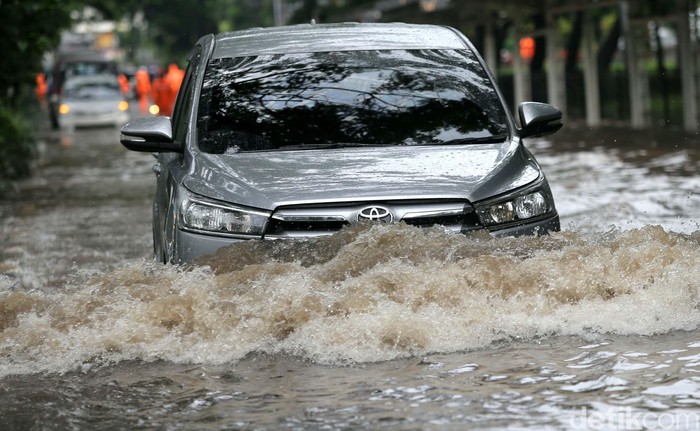 Aksi Pengendara Terobos Banjir di Cempaka Putih