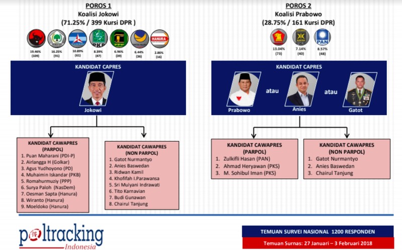 Jokowi tetap menang lagi dalam simulasi demikian: Jokowi-AHY vs Gatot Nurmantyo-Anies Baswedan. Kubu Jokowi mendapatkan 50,9% melawan kubu Gatot yang mendapatkan 13,1% suara respondens. Survei ini menggunakan metode stratified multistage random sampling, dilakukan pada 27 Januari sampai 3 Februari 2018, jumlah respondens sebanyak 1.200 orang. Margin of error survei ini sebesar kurang lebih 2,83%. (Poltracking Indonesia)