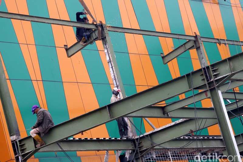 Pekerja mencopot batang-batang besi rangka bangunan tersebut.