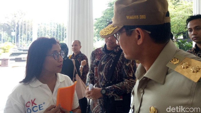Foto: Sandiaga langsung menemui warga yang mengadu saat tiba di Balai Kota, Jalan Medan Merdeka Selatan,Β Jakarta Pusat, Senin (19/3/2018). Tak seperti biasanya, dia mengenakan topi komando dengan lambang bintang dua di topinya. (Fida-detikcom)
