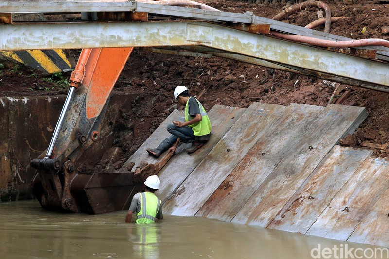 Pekerja Pasang Pelindung Tepi Sungai Kalimalang